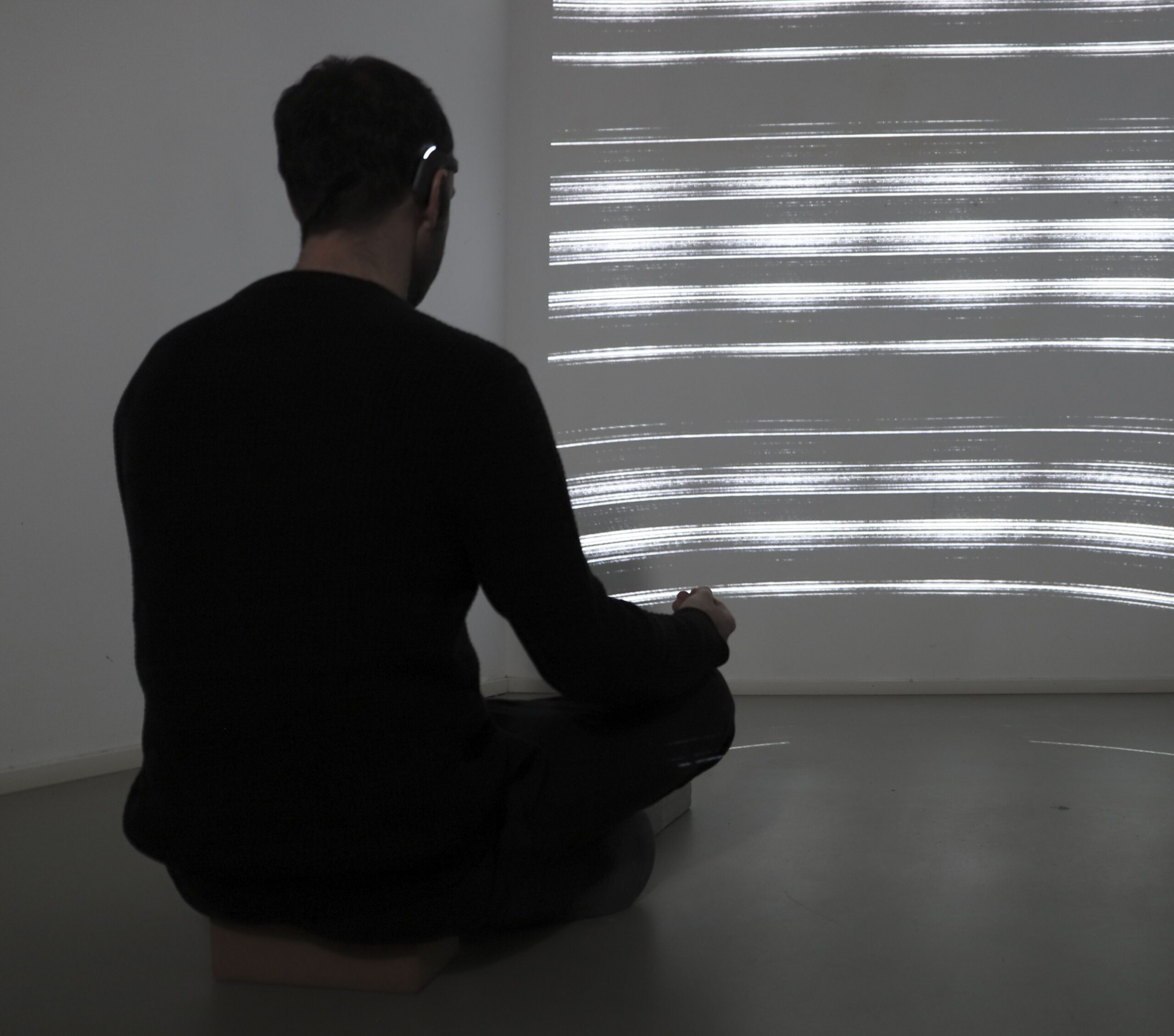 meditation is a performative installation. An EEG sensor measures the artist‘s brain waves in real time, which control the projection in front of him. Each of the five different brainwave signals triggers oscillators, generating real-time visualizations that are projected onto the wall. This work reflects the critical handling of human body data and the potential to use it in different ways.